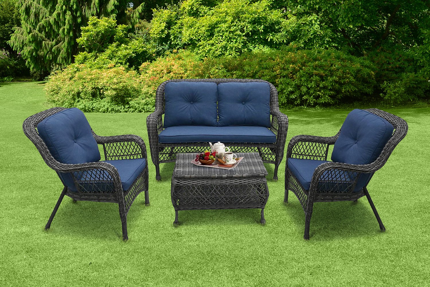 Эстетика данного набора – отдых в изысканных креслах глубокого сине-черного цвета. Такой элемент мебели отлично впишется в сад поместья или большой дачи, и. к тому же, с легкостью на нем сможет разместиться большая семья или группа приятелей, ведь в нем 5 посадочных мест.